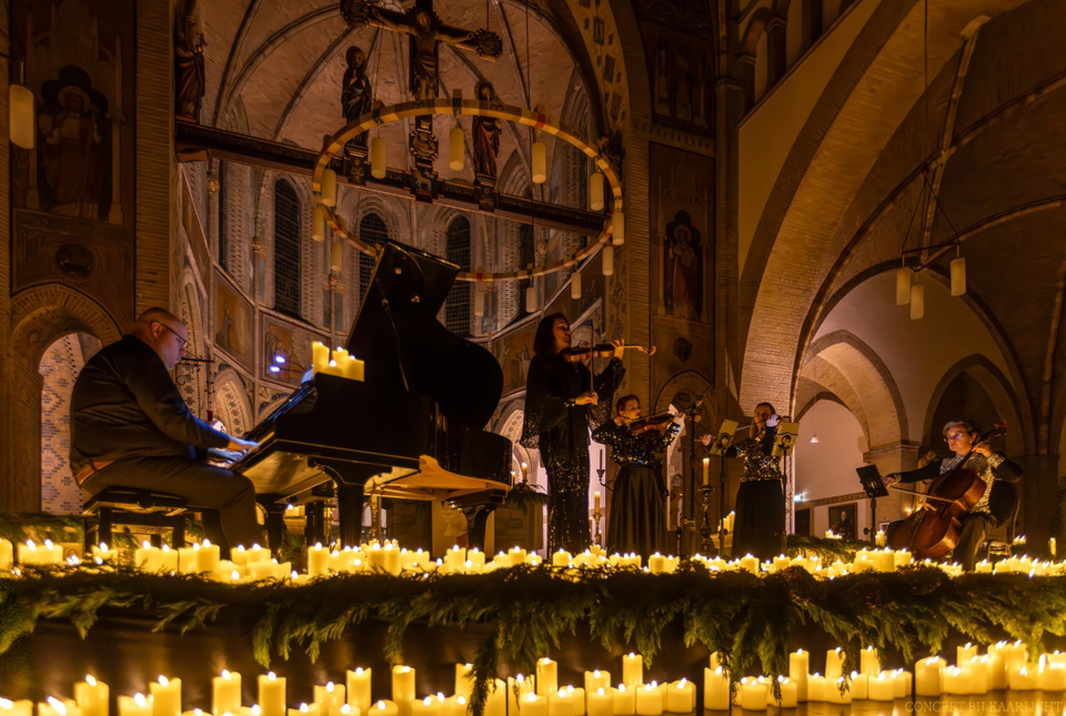Een kerk gevuld met kaarslicht en sfeervolle muziek van strijkers en piano.